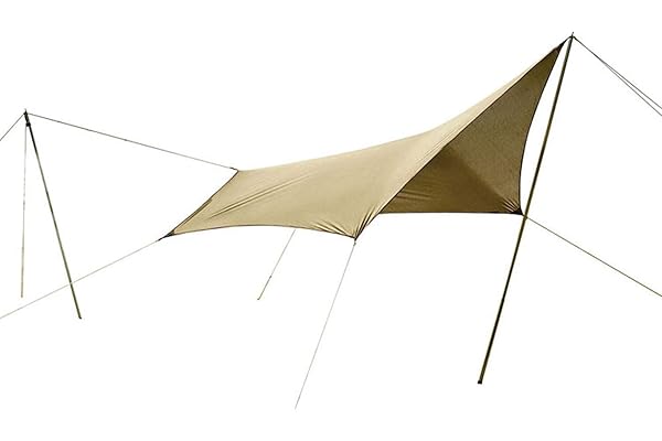 キャンツー、小川張用に購入セッティングテープが付属タープ後端とテープ先端にバックルがついておりタープとテープの接続が簡単ソロ用に最適サイズ、2人用山岳テントの前半分➕チェア、テーブル、シートバッグ等置いて若干余裕のあるスペース、広すぎず狭すぎず収納サイズがコンパクト、タープ本体の重量500g強と軽く積載に制限のあるキャンツー向きペンタ形は張り姿が綺麗で映えるUV機能付き遮光具合まずまずで晴雨どちらにも使えるポール長は前180センチ、後ろ140センチで使用2人用山岳テントとの組合せではテープが長すぎる折りたたみ、折りたたみ部をクリップで止め短くして使用ガイロープも長すぎカットして使用前後のガイロープまでだと、そこそこの長さあり狭めのサイトだと張れない可能性あり収納サイズ、重量、機能、張り姿については満足テープが長すぎたことと耐久性についてはこれから現行不明ということで星四つとした。