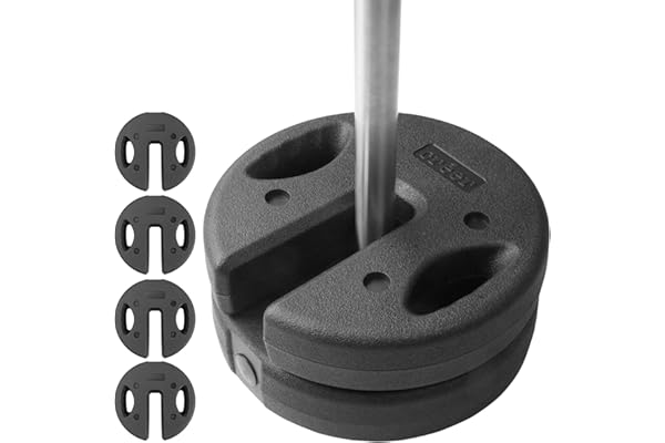 【商品詳細】 サイズ (約)φ28×6.5cm 重量 (約)6kg(1個あたり) 材質 ポリエチレン 24kgは6kg×4個入り、12kgは6kg×2個入りになります。 【両手で持てる】持ち手が左右に分かれているから両手で持てる。女性でも車やアウトドアワゴンからの運搬がこれまでも容易位になりました。 【「重ねて」「挟んで」しっかり固定】 互い違いに挟むように重ねて設置することで、フレームが抜ける事なくしっかり固定できます。ズレ動かないように上下の凹凸がはまるよう設置をお願いいたします。 【濡れても錆びないポリエチレン製】 ウエイトは錆びにくいポリエチレン製。また汚れてもサッと拭くことができます。