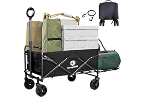 折りたたみ式テールゲートのデザイン: 折りたたみ式のテールゲートが、ギアを簡単に収納でき、130Lの収納容量でテント、キャノピー、テーブルと椅子、調理器具など、豊富なスペースを提供します。折りたたみ式なので、長尺物や不定形な荷物もラクラク収納可能で、家族旅行やキャンプに最適です。また、ペットワゴンベビーカーとしてもお使いいただけ、大型・高齢・怪我をしたペットにも最適です。 高品質の頑丈さと耐久性が持つワゴン: 当社の折りたたみ式ワゴンカートは、堅牢な鉄フレームと溶接された構造で製造され、頑丈で耐久性に優れています。防水で取り外し可能な600D生地は簡単に掃除でき、最大265ポンドの耐荷重を持ち、金属フレームは酸化防止と耐腐食性があり、屋外での使用にも適しています。 回転ホイールがスムーズで取り回し抜群: 前輪が360°回転するこのワゴンは、どんな場面でもスムーズに移動し、取り回しも驚くほど容易です。また、この特長が使い勝手を向上させ、快適で効率的な利用が可能となります。 調整可能な自動リバウンドハンドル付き: 柔軟で伸縮可能なハンドルが搭載され、さまざまな人々のニーズに適合します。ハンドルは自動的に元の位置にリバウンドし、引っ張ったり、回転したり、操作したりするのが非常に簡単です。 簡単で迅速な折りたたみが可能デザイン: 当社のガーデンカートは数秒でセットアップ&折りたたむことができ、組み立ては必要ありません。折りたたんだ後は占有スペースが少なくなり、SUVや車のトランクに垂直または水平に置くことができます。
